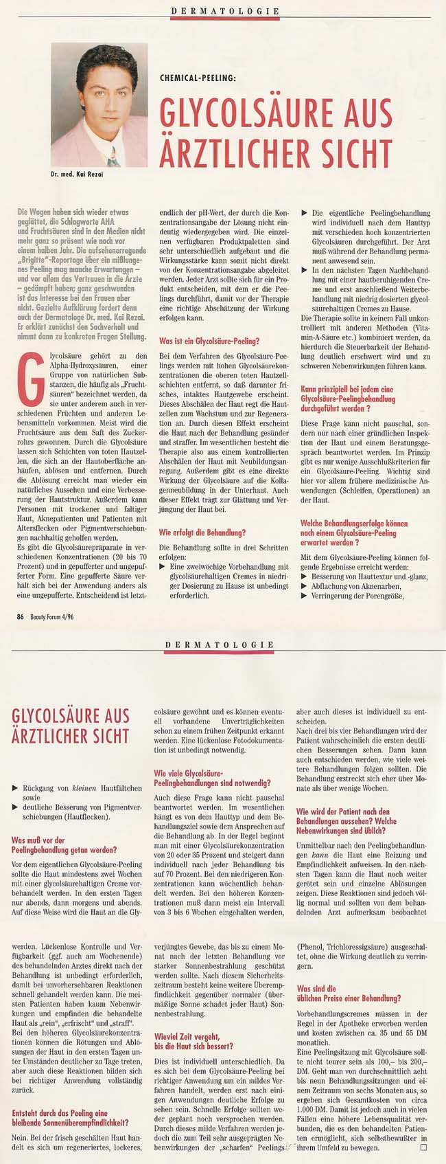 Dr. med. Kai Rezai war Mitte der 90er Jahre einer der Pioniere der Peeling Behandlungen in Deutschland. Seine Expertenmeinung war schon früh in der Presse gefragt.
